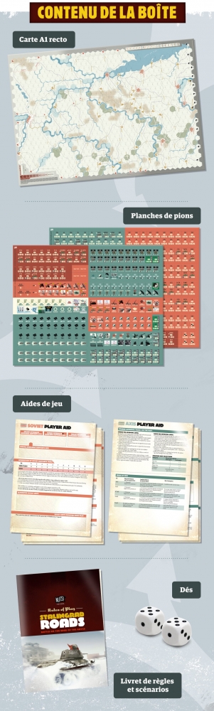 Stalingrad Roads est un wargame pour 2 joueurs couvrant la campagne de l'hiver 42-43 sur le front sud soviétique. Le jeu débute par le déclenchement de l'offensive Uranus fin novembre 1942 et se termine par la contre-attaque de Manstein en mars 1943.