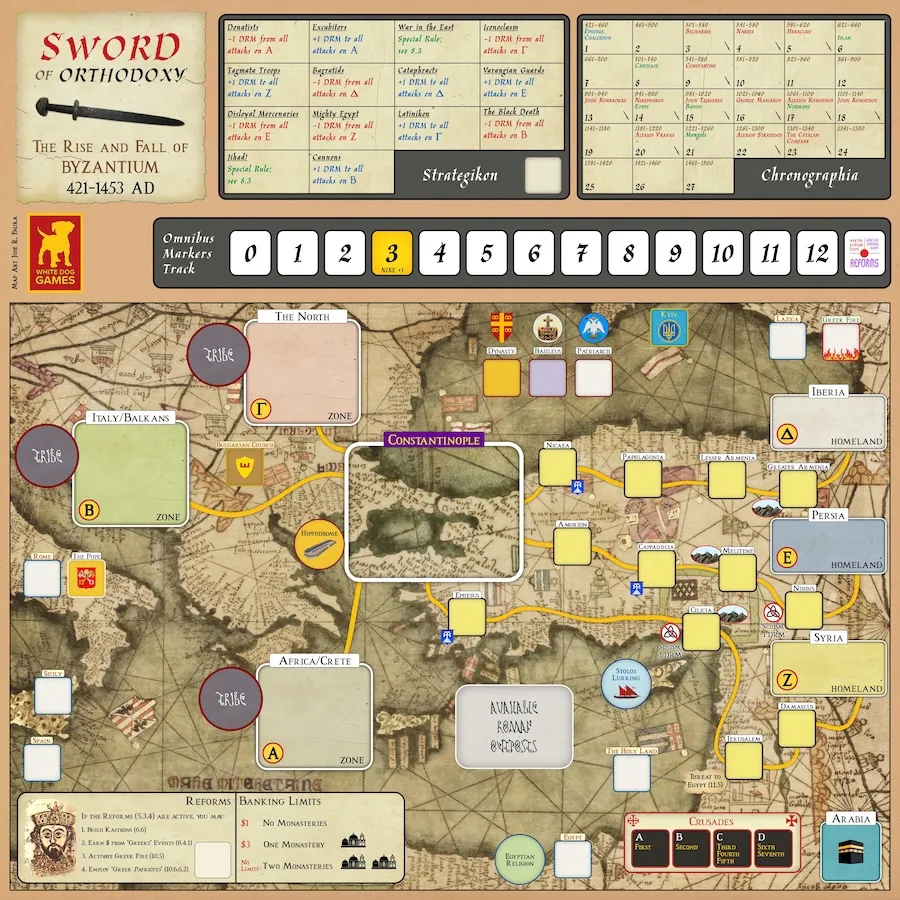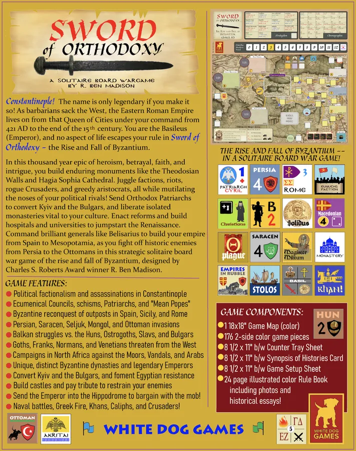 Sword of Orthodoxy est un jeu stratégique en solitaire sur l'essor et la chute de l'Empire Bizantin, simulant son histoire de 421 avant J.-C. jusqu'à la fin du 15è siècle - une épopée millénaire d'héroïsme, de trahison, d'intrigue et de réussite culturelle.
