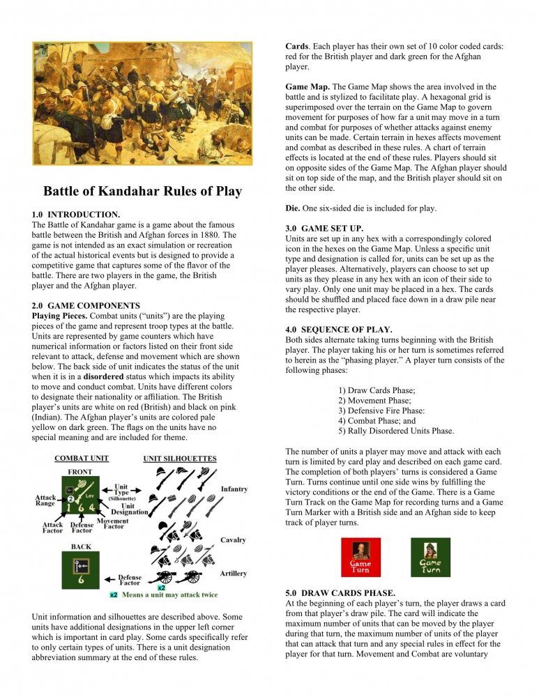 Battle of Kandahar est un jeu tactique de complexité faible à moyenne qui couvre l'attaque britannique contre les Afghans à Kandahar en 1880. Le jeu dure environ 90 minutes. Un joueur commande les forces britanniques et l'autre les forces afghanes. Les cartes font varier le déroulement du jeu.