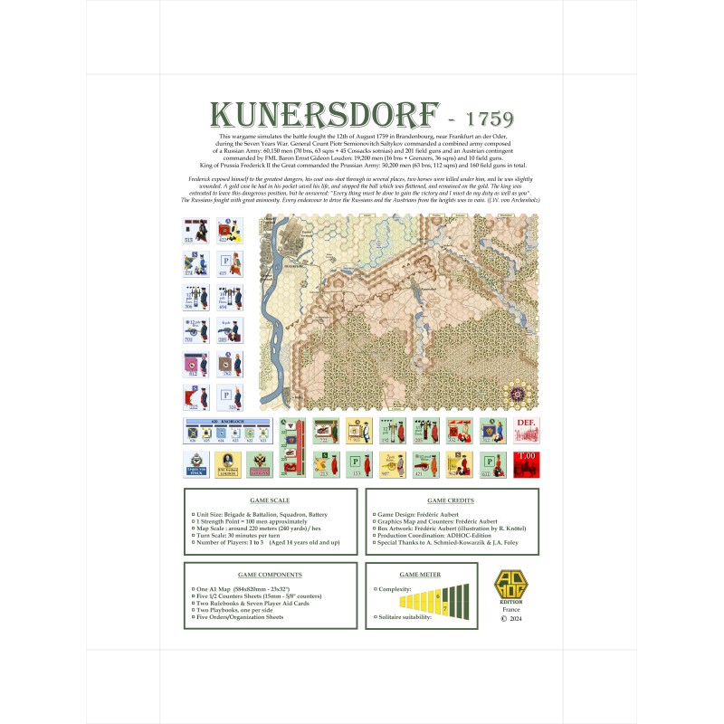 Kunersdorf 1759, le troisième jeu de la série "SYWBS", simule la bataille livrée le 12 Août 1759 dans le Brandenbourg, près de Frankfurt/Oder, pendant la guerre de Sept Ans. Le général Comte Piotr Semionovitch Saltykov commandait une armée combinée composée d'ue armée russe: 60 150 hommes (70 bataillons, 63 escadrons et 45 sotnias de cosaques) et 201 canons et un contingent autrichien commandé par le FML baron Ernst Gideon Loudon: 19 200 hommes (16 bataillons + grenzers, 36 escadrons) et 10 canons. Le roi de Prusse Frédéric II le Grand commandait l'armée prussienne : 50 200 hommes (63 bataillons, 112 escadrons) et 160 canons au total.