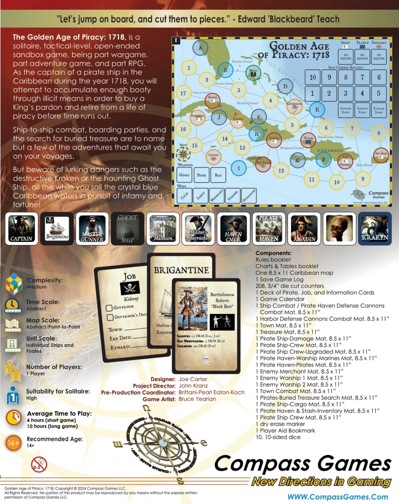 Golden Age of Piracy: 1718 est un jeu en solitaire tactique, de type "bac à sable", qui tient à la fois du wargame, du jeu d'aventure et du jeu de rôle. En tant que capitaine d'un navire pirate dans les Caraïbes en 1718, vous tenterez d'accumuler suffisamment de butin par des moyens illicites afin d'obtenir le pardon du roi et vous retirer de la vie de pirate avant la fin du temps imparti.