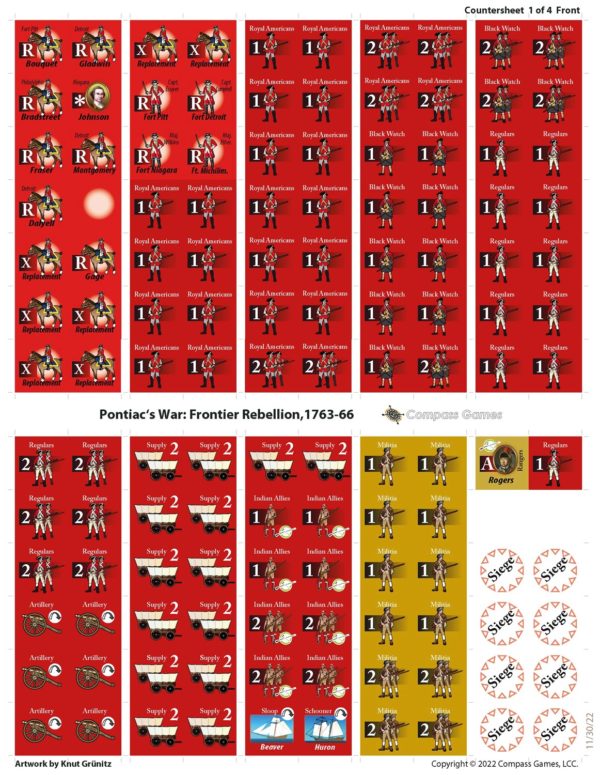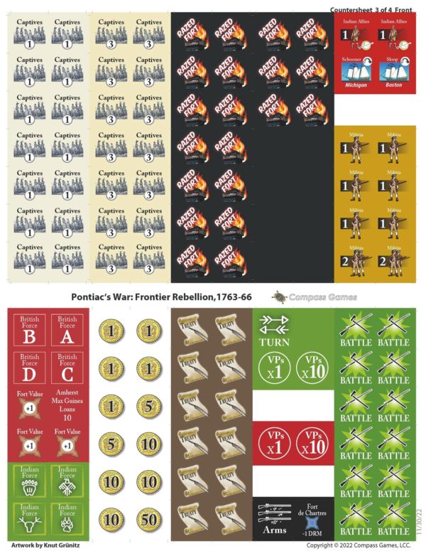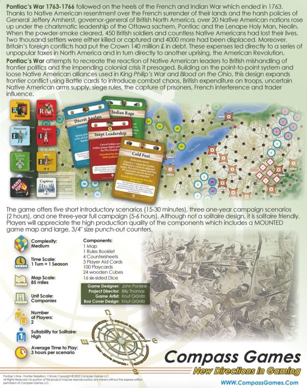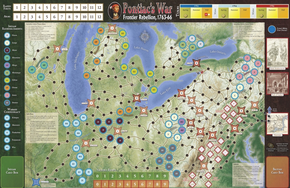 Pontiac’s War attempts to recreate the reaction of Indian leaders to British mishandling of frontier politics and the impending colonial crisis it presaged. Building on the point-to-point system and loose Indian alliances used in King Philip’s War and Blood on the Ohio, this design expands frontier conflict using Battle cards to introduce combat chaos, British expenditure on troops, Uncertain Indian Armssupply, siege rules, the capture of prisoners, French interference and trader influence.