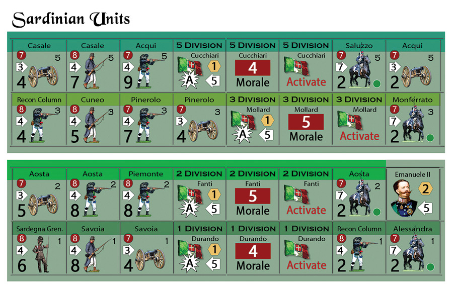 Ce traitement de Solférino est une adaptation du système Blind Swords de Hermann Luttmann. Ce système fait la part belle à l'imprévisibilité et au brouillard de guerre grâce au mécanisme de tirage. Ce mécanisme favorise également le jeu en solitaire, tout comme les règles d'activation variables et les tables de renfort. Un certain nombre d'autres caractéristiques contribuent à rendre le jeu en face à face attrayant, notamment le système d'initiative stratégique, un certain nombre de variantes de scénarios et de règles optionnelles, le système optionnel de bataille de rencontre (axé sur la modification des conditions de départ et de renfort pour permettre à la bataille de se dérouler différemment) et les pions d'événements de mouvement et de contre-mouvement. Les pions d'événements spécifiques à chaque nation apportent également un peu de saveur à l'époque.
