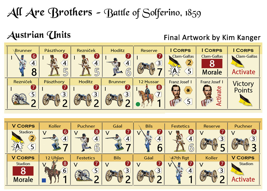 All are Brothers: Solférino 1859 simule la bataille décisive de la deuxième guerre d'indépendance italienne au niveau de la brigade, avec quelques détachements supplémentaires de la taille d'un régiment ou plus petits. Les chefs nationaux, d'armée et de corps sont représentés sur une carte dessinée par Rick Barber à 500 mètres par hexagone, avec des tours d'une heure. Quatre scénarios sont inclus : trois qui couvrent séparément les secteurs nord, central et sud de la bataille, ainsi qu'un scénario combinant l'ensemble de la bataille. Le scénario du secteur nord - « San Martino » - est le plus petit et sert d'introduction à la bataille et aux règles du jeu. Le scénario combiné peut être joué par quatre joueurs (France, Sardaigne-Piémont, 1ère Armée autrichienne et 2ème Armée autrichienne).
