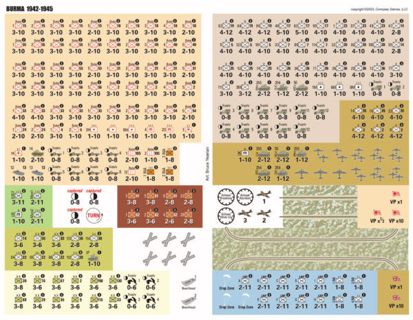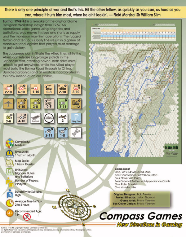 Burma, 1942-45 est un remake du jeu original de Game Designers Workshop (1976). Il s'agit d'un jeu à l'échelle opérationnelle utilisant des brigades et des bataillons. Le jeu se déroule par à-coups, car le ravitaillement et la mousson peuvent limiter les opérations. Le terrain accidenté et les lignes de ravitaillement ténues donnent lieu à un jeu de manœuvres et de logistique que les joueurs doivent gérer pour remporter la victoire. Les Japonais peuvent infiltrer les lignes alliées tandis que les Alliés peuvent lâcher des patrouilles loin derrière les lignes japonaises, créant ainsi le désordre. Les deux camps doivent attaquer pour avancer, tandis que le joueur allié doit construire la route de Birmanie jusqu'à la Chine.