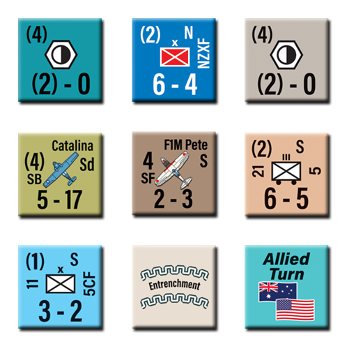 Les points logistiques (ATP) représentent la capacité de transport maritime (pour les Japonais) et les communications terrestres (pour les Alliés), compte tenu des distances entre les principales bases alliées dans le sud de l'Australie et le théâtre d'opérations actuel dans le nord de l'Australie.