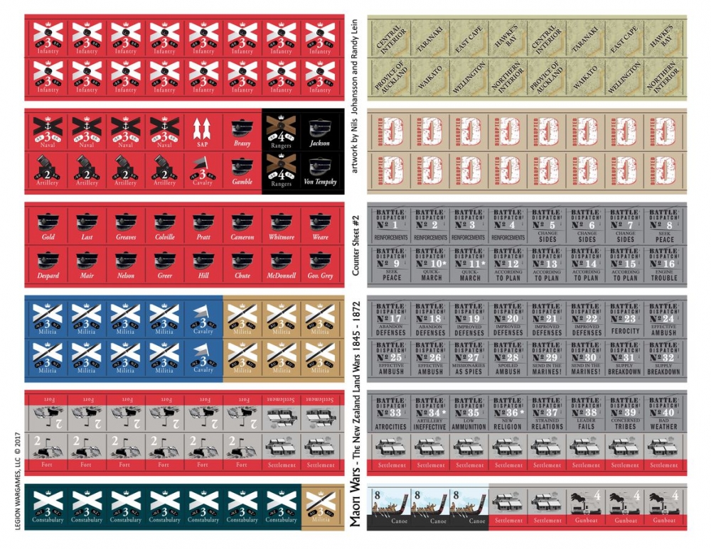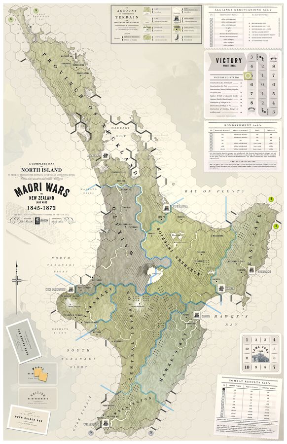 Maori Wars is a simulation of the principal uprisings that took place between 1845 and 1872 due to British colonial incursions into native Maori lands on the North Island of New Zealand. Conflict involved the destruction of numerous villages, pas (strongly fortified villages that featured intricate trench-works) and colonial settlements. The war introduced the British to a wily well-armed enemy whose defense works and strategy of ambush surprised and stymied them. As scenarios progress so does the extent of the conflict. More British regulars, native born Australian troops and New Zealand militia enter and are allied with increasingly more tribes who tend to change sides at the most inopportune times (those supporting the British came to be known as Queenites). Historical scenarios feature low counter density, quick play time (under two hours), and features a novel bush-raiding rule that allows the Maori player to move units temporarily off the map and then back in a location of his choice. As the British player gains experience he learns to track these tribes. At which point he enters and battles these units in the bush. Maori resistance is dependent on village support so as fortified villages fall to British control, resistance melts away. Random battle dispatches reflect historical circumstances. Events such as: SEEK PEACE, NEW RELIGION, and CONCERNED TRIBES force players to deal with new and developing crises. The English may build forts but are penalized for fort-building as they historically caused local uprisings. Canoes and gunboats allow rapid transport and in the case of gunboats waterborne artillery support. Standard British artillery and cavalry are introduced but play only a minor supporting role. Terrain and knowledge of the terrain is the Maori’s secret weapon. Relative troop strength is designed to allow the possibility of historical outcomes not the proportionate historical strength. The overwhelming British superiority of men and firepower made the successes of the Maori forces all the more remarkable