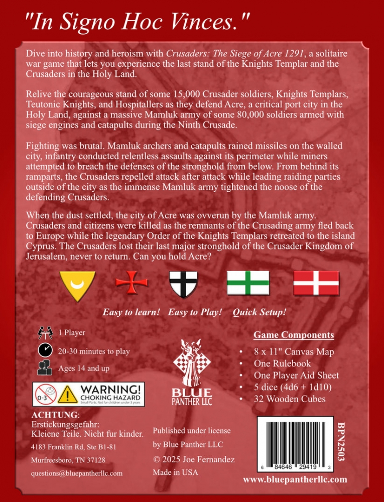 Plongez dans l'histoire et l'héroïsme avec Crusaders : The Siege of Acre 1291, un jeu en solitaire qui vous permet de vivre le dernier combat des Templiers et des Croisés en Terre Sainte.
