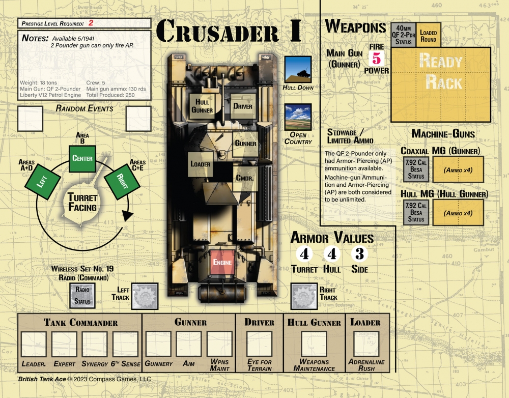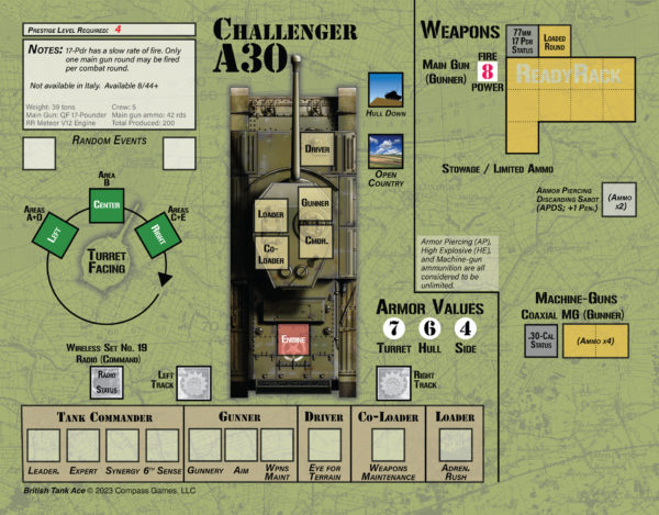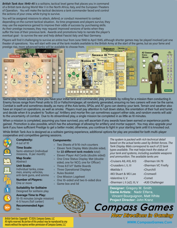 British Tank Ace: 1940-45 est un jeu tactique solo créé par Gregory M. Smith qui vous place aux commandes d'un char britannique pendant la Seconde Guerre mondiale en Afrique du Nord, en Italie et sur les théâtres d'opérations européens. Vous prendrez les décisions tactiques auxquelles un commandant de char est confronté et contrôlerez les actions de votre équipage tout en essayant de survivre.
