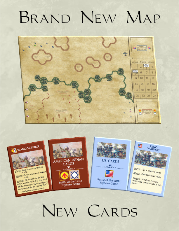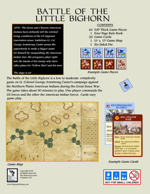 Battle of Little Bighorn est un jeu tactique de complexité faible à modérée qui retrace la campagne du lieutenant-colonel George Armstrong Custer contre les Amérindiens des plaines du Nord pendant la Grande Guerre des Sioux. Une partie dure environ 90 minutes. Un joueur commande les forces américaines et l'autre joueur commande les forces amérindiennes. L'utilisation de cartes permettent de varier le déroulement du jeu.
