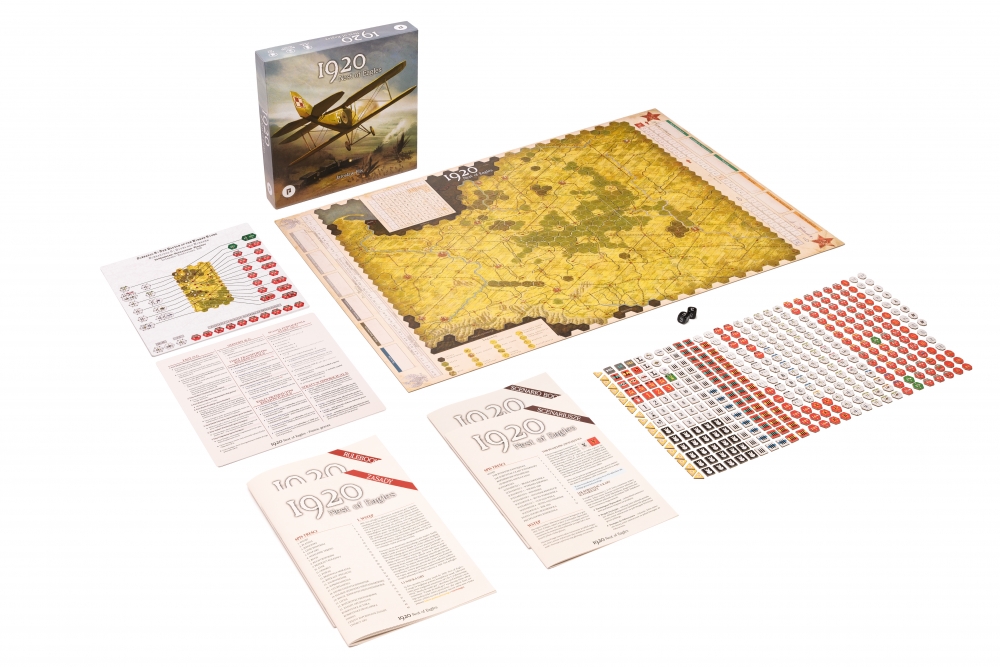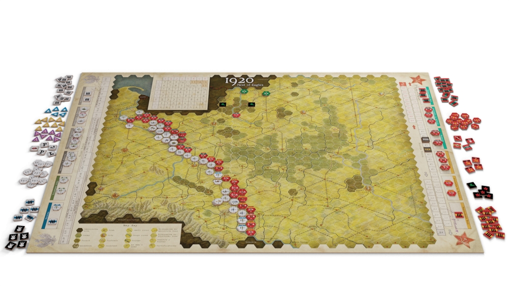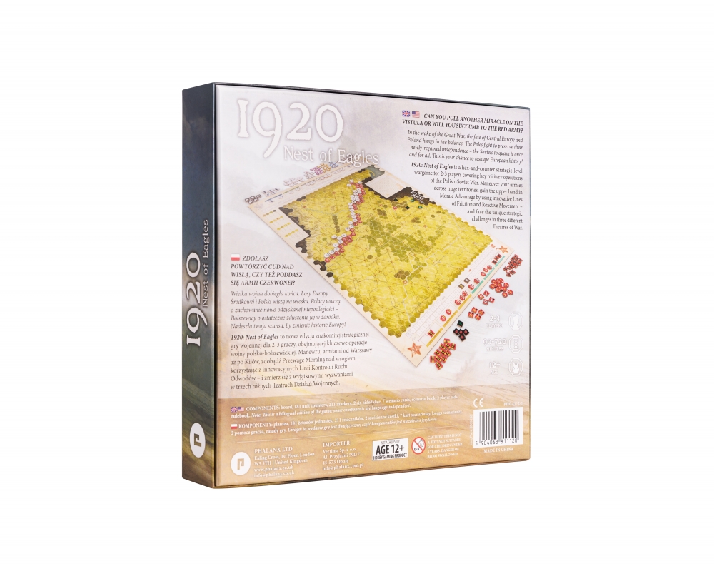 1920: Nest of Eagles est la tentative soviétique de conquérir la Pologne. Les forces soviétiques et polonaises s'affrontent dans des campagnes rapides, combattant sur une vaste zone s'étendant de Kiev et Smolensk à l'est à Varsovie et Thorn à l'ouest. Conçu pour deux joueurs (avec une variante à trois joueurs), il simule les plus grandes opérations militaires de la guerre polono-soviétique. Il s'agit d'un jeu au niveau stratégique, de complexité intermédiaire, qui présente des concepts innovants tels que les lignes de friction (au lieu des zones de contrôle), les mouvements de réaction et l'avantage moral, tous conçus pour créer des défis stratégiques uniques auxquels sont confrontés les deux commandants sur trois théâtres de guerre différents. Les deux joueurs ont également accès à de nombreuses unités uniques et doivent composer avec la loyauté déchirée des Ukrainiens, qui combattent des deux côtés du front.