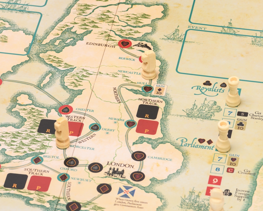 A Very Civil Whist est un jeu unique qui combine des aspects de jeu de levées et de contrôle de territoire dans le contexte historique de la guerre civile anglaise.