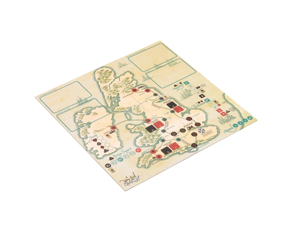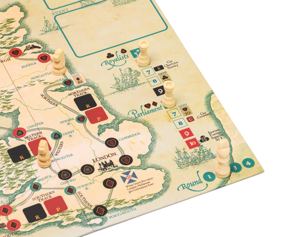 Le gameplay implique que les joueurs royalistes et parlementaires s'affrontent dans un bras de fer sur différents parcours liés aux couleurs des cartes. Gagnez une levée dans la couleur correspondante et gagnez du territoire dans la région ciblée d'Angleterre. Vous pouvez utiliser des généraux et des personnalités célèbres de la guerre civile anglaise pour augmenter vos chances de gagner une levée. Mais si vous perdez la levée, le général risque de connaître une fin tragique. Des événements aléatoires au début de chaque manche ajoutent encore plus de piquant et de variabilité au jeu.