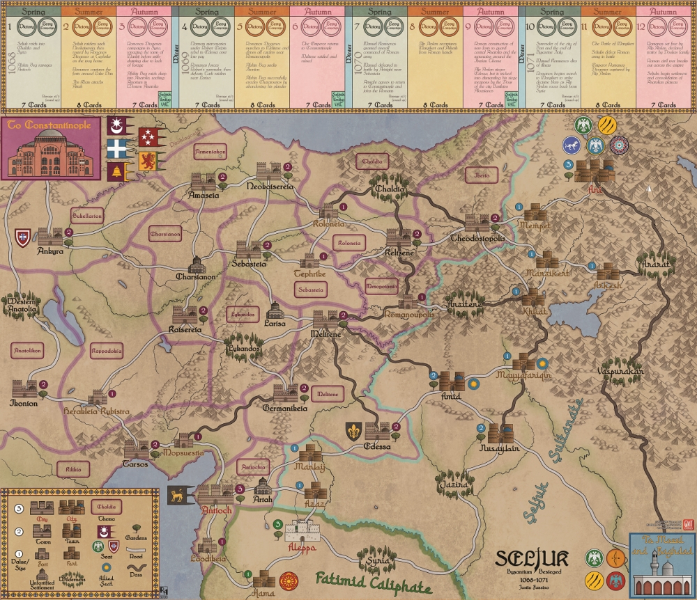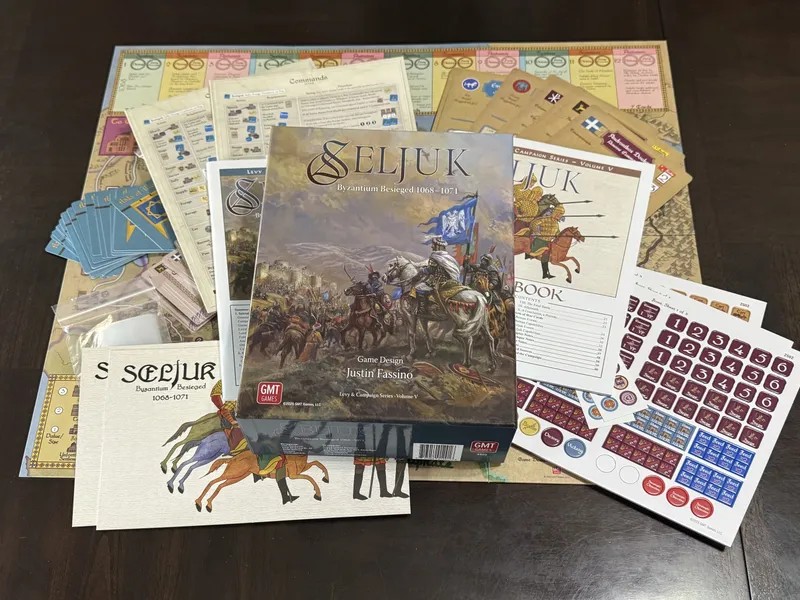 Seljuk - Volume V de la série Levy & Campaign de Volko Ruhnke - plonge les joueurs dans les défis de la logistique médiévale et des manœuvres à travers l'Asie Mineure pendant le conflit entre les puissances chrétiennes orthodoxes et musulmanes qui a conduit à la bataille décisive de Manzikert. Les joueurs incarneront soit les Romains d'Orient, soit les Turcs seldjoukides, qui cherchent à laisser leur empreinte sur cette terre historique. Des objectifs de victoire asymétriques et des ajouts nouveaux et uniques au système Levy & Campaign garantissent un jeu dynamique du chat et de la souris entre ces deux grandes puissances.