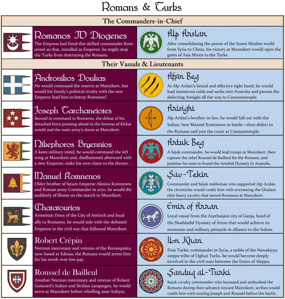 Les Romains alignent un contingent d'infanterie et de Tagmata montés beaucoup plus lourdement armés, mais leurs garnisons frontalières, les Themata, sont peu nombreuses et difficiles à remplacer. Les Romains devront utiliser ces unités stationnaires à bon escient pour se défendre contre les ravages des Seldjoukides ou protéger les villes fortifiées de l'Empire contre les sièges turcs.