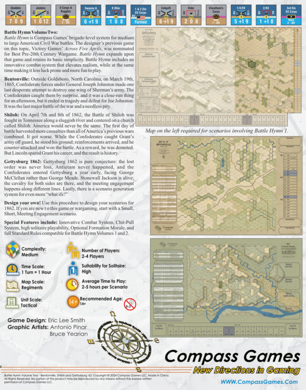 Battle Hymn: Volume 2 est la suite tant attendue du Volume 1 et comprend deux jeux complets : Shiloh et Bentonville. Battle Hymn est le nouveau système au niveau de la brigade basé sur les dernières recherches sur les combats de la Guerre de Sécession. Ce nouvel opus de la série introduit une carte d'extension pour Gettysburg (Volume 1) afin de proposer une histoire alternative complète de toute la bataille. Conçu par Eric Lee Smith, lauréat du prix Charles S. Roberts.
