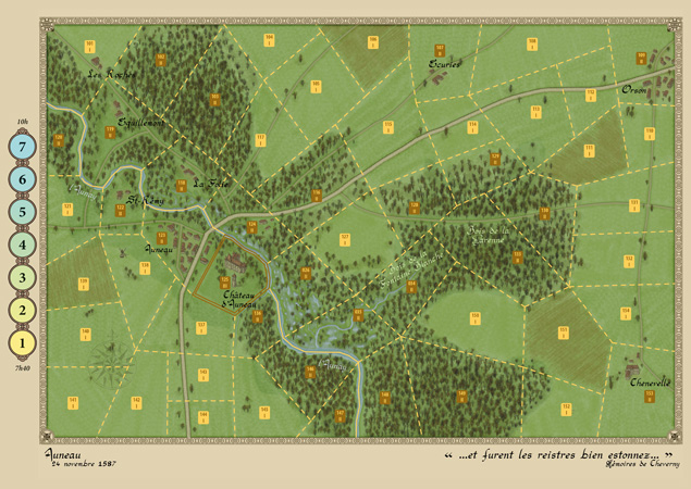 Auneau (24 novembre 1587) : Sur la route pour tenter de franchir la Loire (au sud de la carte) et rejoindre l’armée de Henri de Navarre dans le Sud-Ouest de la France, les reîtres font une halte à Auneau. Le château étant occupé par une faible garnison catholique, les reîtres occupent le reste du bourg. A la faveur de la nuit, le gros des troupes catholiques pénètre dans le village par le parc du château.