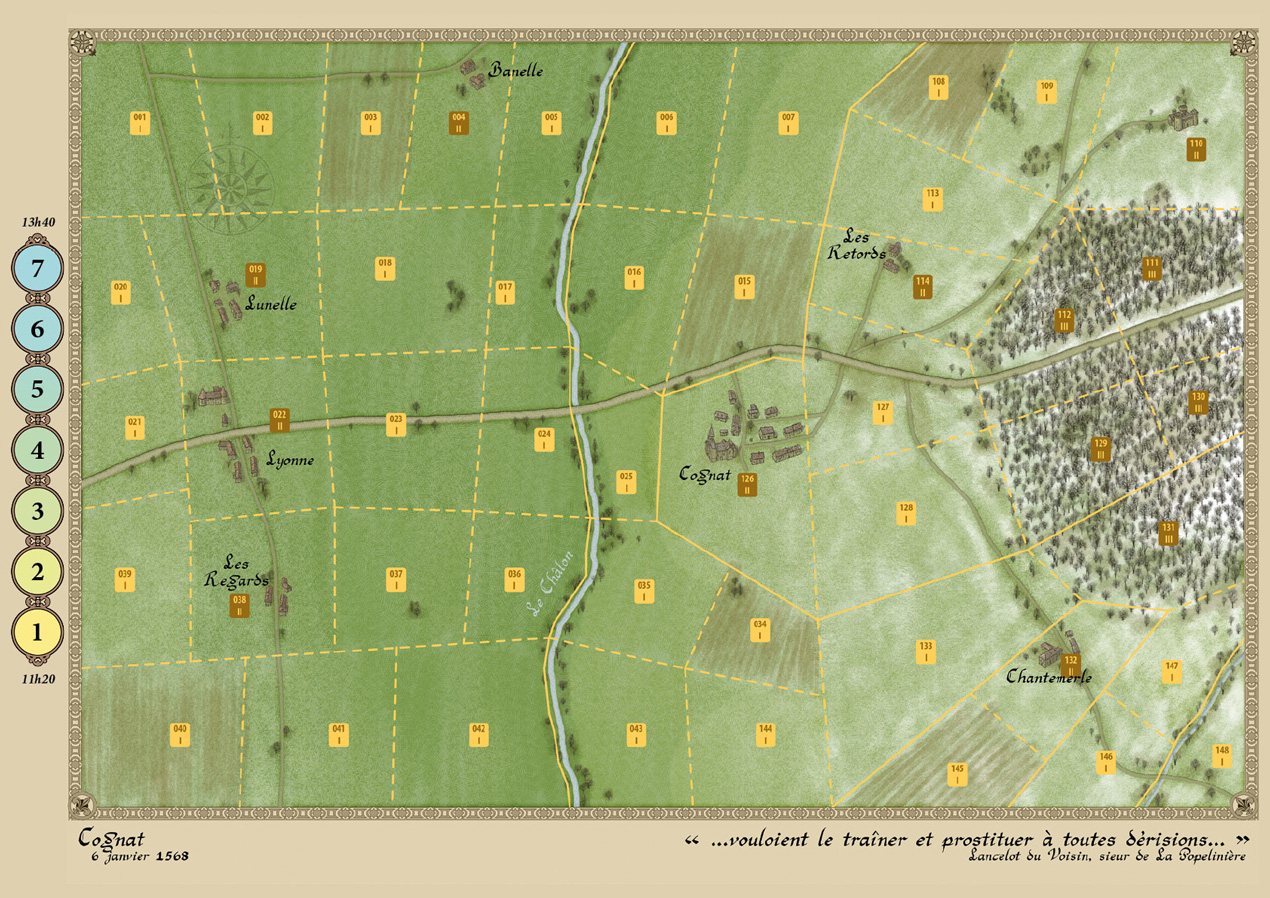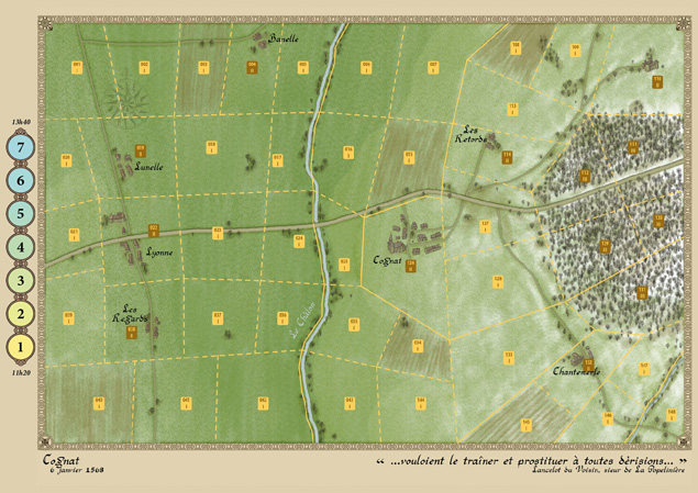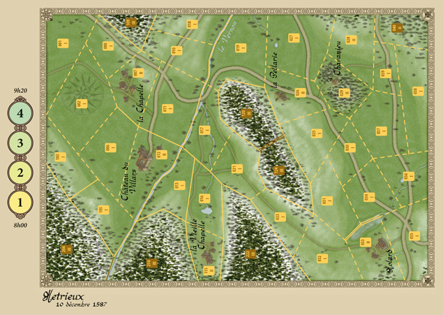 Métrieux (10 décembre 1587) : Massif du Pilat, le 10 décembre 1587 : le temps est triste et froid, le ciel gris, le plafond bas. Après la défaite des mercenaires allemands à Auneau face au duc de Guise le 24 novembre 1587, une troupe protestante tente de regagner sa base en Vivarais avec un petit contingent de soldats. Ce dernier comprend une centaine de cuirassiers et environ deux cents arquebusiers à cheval. Son chef est François de Châtillon, fils de l’Amiral de Coligny. Au prix de marches forcées, ils ont réussi à tenir à distance l’armée des Catholiques lyonnais qui a reçu l’ordre de les intercepter. Les hommes sont aussi épuisés que les chevaux, ils sont tenaillés par la peur de traverser ce Pilat qui leur est hostile, mais ils croient en un petit miracle qui leur ferait retrouver leurs foyers avant la nuit. Les Catholiques, bien plus nombreux, pensent avoir facilement raison de cette petite troupe et ainsi pouvoir faire main basse sur leurs bagages… Cette petite bataille constitue une introduction au système, avec peu de pions et une carte de taille réduite.