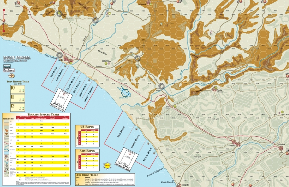 Danger Forward est un jeu complet couvrant la bataille de Gela qui s'est déroulée du 10 au 12 juillet 1943 en Sicile. À la suite des premiers débarquements de l'opération Husky, les Italiens et les Allemands étaient déterminés à repousser les forces américaines vers la mer. Ils lancèrent une attaque vigoureuse qui faillit réussir, bombardant les plages avec des tirs de chars. Les forces terrestres américaines, soutenues par la Royal Navy et la marine américaine au large, se sont battues avec acharnement pour éviter la défaite. Ne se reposant pas sur leurs lauriers, les forces alliées ont dû progresser vers l'intérieur des terres pour sécuriser les ports et les aérodromes afin de s'emparer définitivement de l'île. La prise de la Sicile a rapidement conduit à l'invasion de l'Italie et, finalement, à la chute de Mussolini. Tout cela ne tenait qu'à l'issue des combats à Gela.