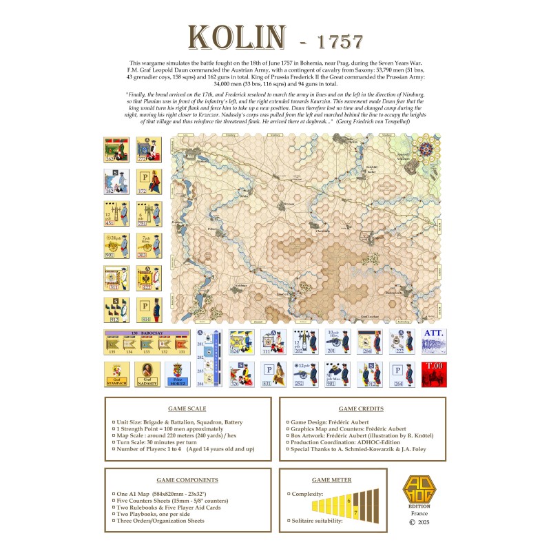 Kolin 1757, le cinquième jeu de la série "SYWBS", simule la bataille livrée le 18 juin 1757 en Bohème, près de Prague, pendant la guerre de Sept Ans. Le FeldMarshall Comte Leopold Daun commandait l'armée autrichienne, accompagnée d'un contingent saxon de cavalerie: 53 790 hommes (51 bataillons, 43 compagnies de grenadiers, 158 escadrons) et 162 canons au total. Le roi de Prusse Frédéric II le Grand commandait l'armée prussienne: 34 000 hommes (33 bataillons, 116 escadrons) et 94 canons au total.
