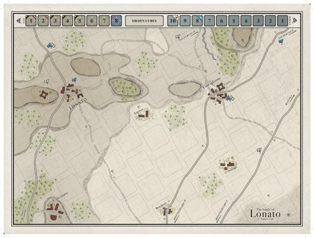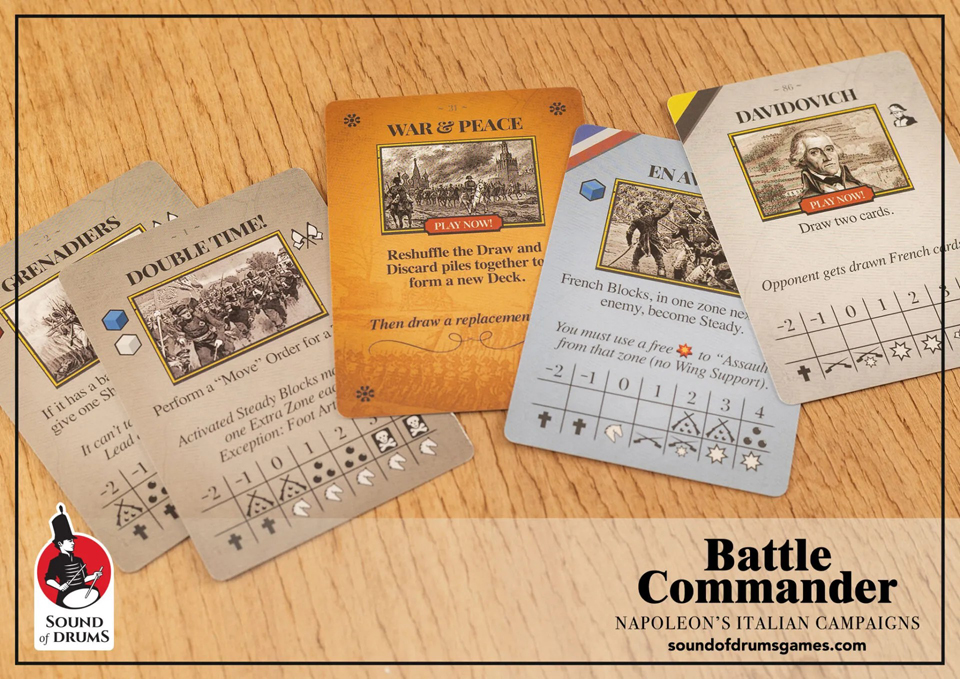 L'activation par tirage de cubes sert à gérer les phases de jeu (mouvement, combat, ralliement, tirage de cartes, etc.), tandis que les cartes sont utilisées pour le système de combat interactif et les événements, offrant ainsi une multitude de possibilités et une expérience de jeu adaptée au solitaire. Pas de dés, pas de calculs de probabilités complexes, pas de marqueurs, pas de temps morts, pas de certitudes !