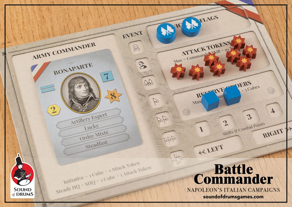 Une carte de personnage représente chaque commandant, ses capacités spécifiques et les ressources de votre armée ; les chefs subalternes, d’une importance capitale, sont intégrés dans un système innovant de cartes polyvalentes.