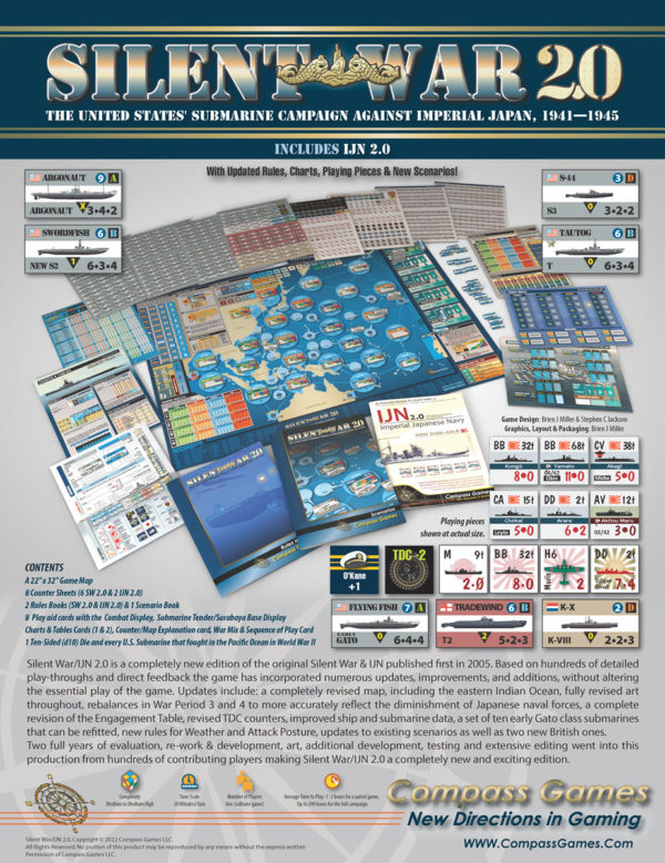 Silent War is a solitaire simulation of the United States' Navy submarine war against Imperial Japan in World War Two. You serve as Commander of Submarines, US Pacific Fleet (ComSubPac). Your mission is to deploy your boats with maximum effect to destroy Japanese shipping, while limiting your own submarine losses.