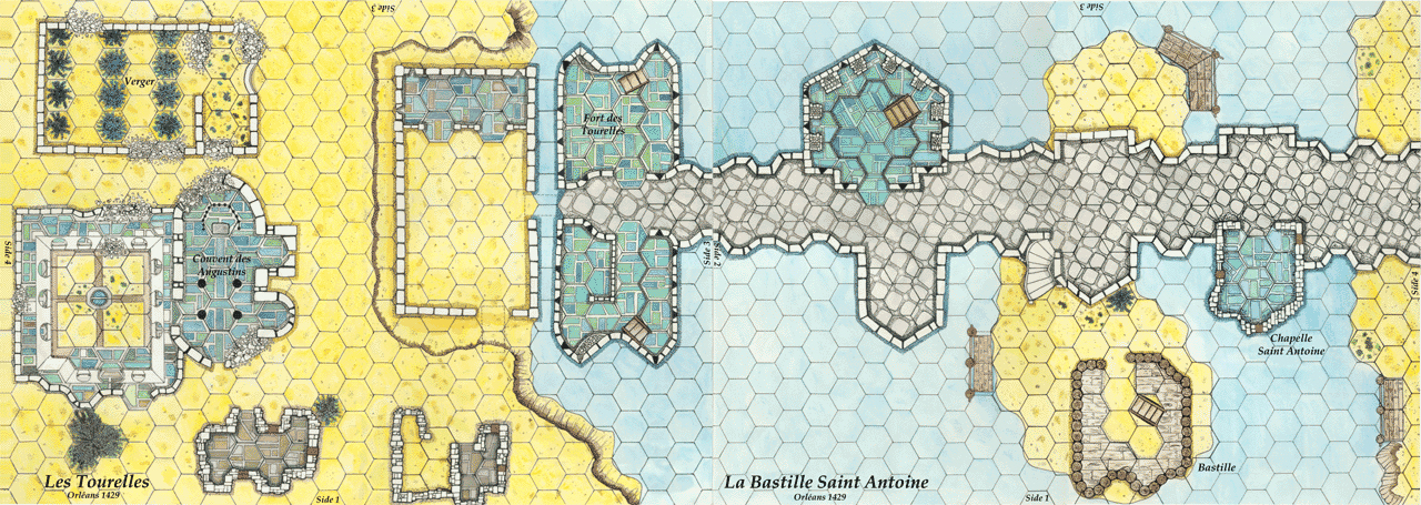 Jeu de 2 cartes montrant une portion des remparts de la ville d'Orléans avec le fort des Tourelles, le couvent des Augustins, le pont sur la Loire et la bastille Saint Antoine.