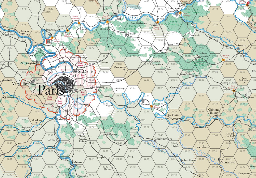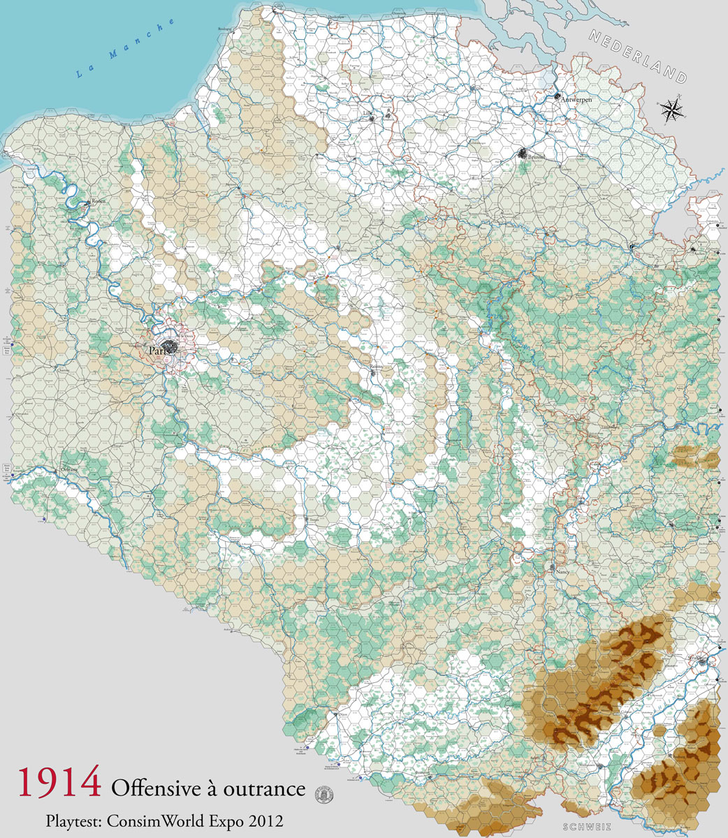1914, Offensive à outrance is a comprehensively researched model that explores this fascinating set of campaigns with an accurate order of battle and detailed game map. The map encompasses the entire theater of war from the English Channel to the Swiss Border. The game system used is a streamlined derivative of the 1914, Twilight in the East system, modified to speed play, with care not to lose focus on those aspects of warfare that made the opening stages of WWI so unique. This game system, in conjunction with the accurate map, allows the German advance to be conducted along historical routes with the eminent “Open Flank” present (instead of units strung out from map edge to map edge). The Allied player has an opportunity to recreate a “Miracle of the Marne” type victory or to stop the Germans earlier. Likewise, the German player has a chance to change history and defeat the Allies’ armies in 1914.