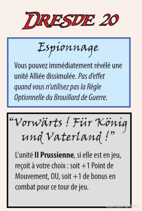 Dresde 20 présente une version “Deluxe” des jeux de la série Napoléon 20, et inaugure la nouvelle sous-série de jeux “Allemagne 20” (qui vous permettrons tous de recréer une campagne complète, les résultats affectant la bataille suivante de la série).