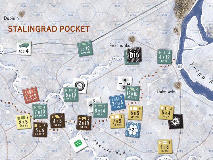 The game features different combat styles for mech/foot units, the importance of support, air and artillery operations, an attrition-based loss system and fog of war, with significant "initiative" benefits that urge both players to keep on attacking (or else...). Players will use 560 two sided counters, representing units from regiments to companies and kampfgruppen. Students of the campaign will enjoy a highly detailed OB, drawn from both German and Soviet sources, and appreciate the realistic allowance of the very limited support of Operation Thunderclap from within the 6th Army pocket.